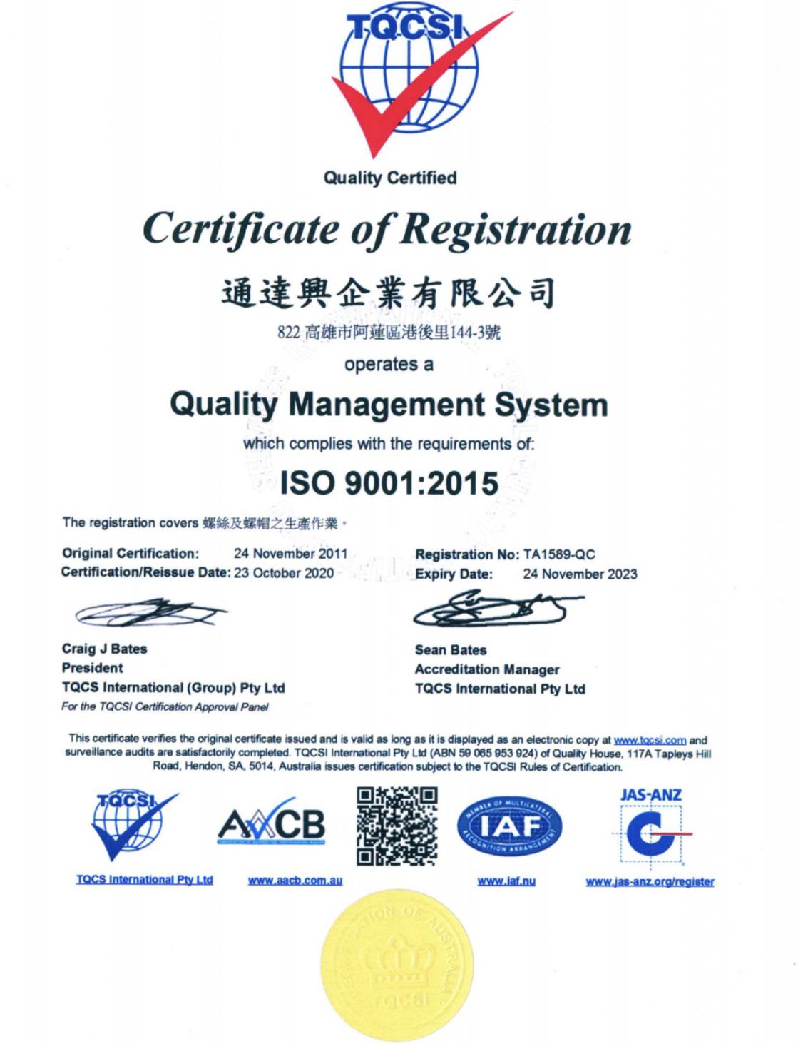 ISO Certified Company ISO 9001:2015 Tone Dar Seen Enterprise Co.,LTD.